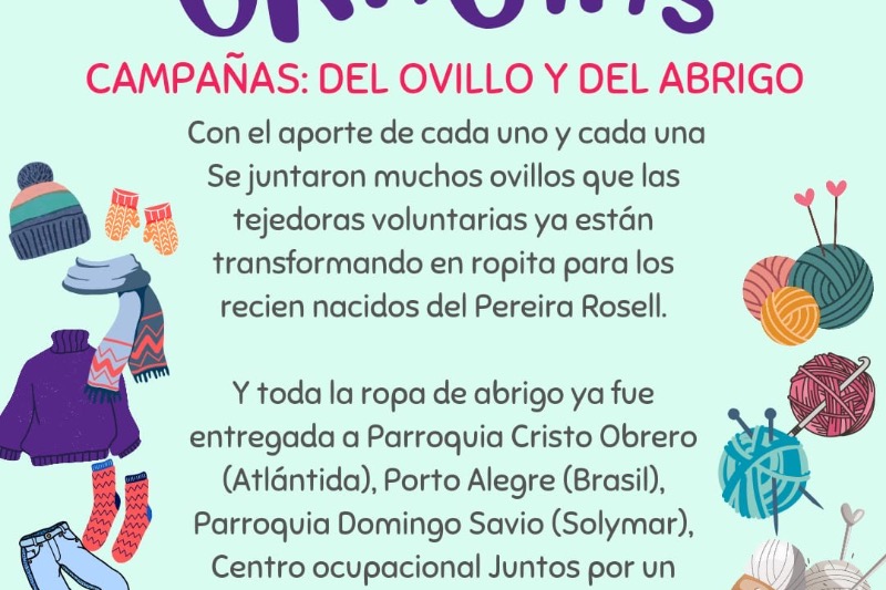 La semana pasada finalizaron las campañas del ovillo y del abrigo, y queremos agradecerespecialmente a todos los que colaboraron con ovillos para, que las integrantes del Taller de tejido puedan tejer ropa y ajuares de invierno para los bebés del Pereira Rossell. Y GRACIAS también por toda la ropa de abrigo que ya fue entregada en distintas instituciones para que el comienzo del invierno sea más llevadero.