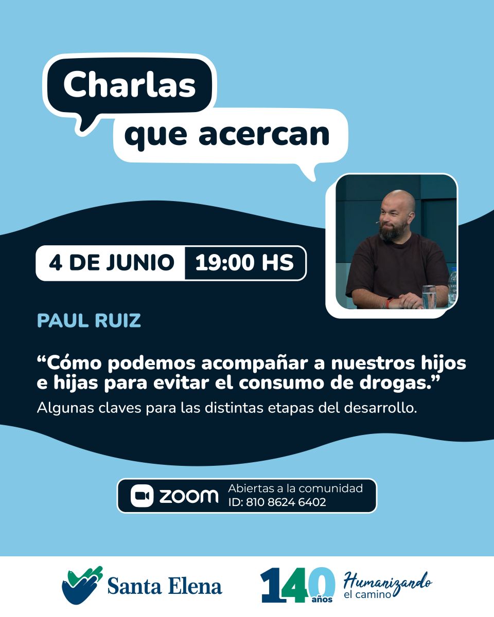 Se viene una nueva edición del ciclo "Charlas que acercan", en esta oportunidad el miércoles 4 de junio a las 19 hs. los/as invitamos a escuchar a Paul Ruiz quien nos hablará sobre "Cómo podemos acompañar a nuestros hijos e hijas para evitar el consumo de drogas". Algunas claves para las distintas etapas del desarrollo.