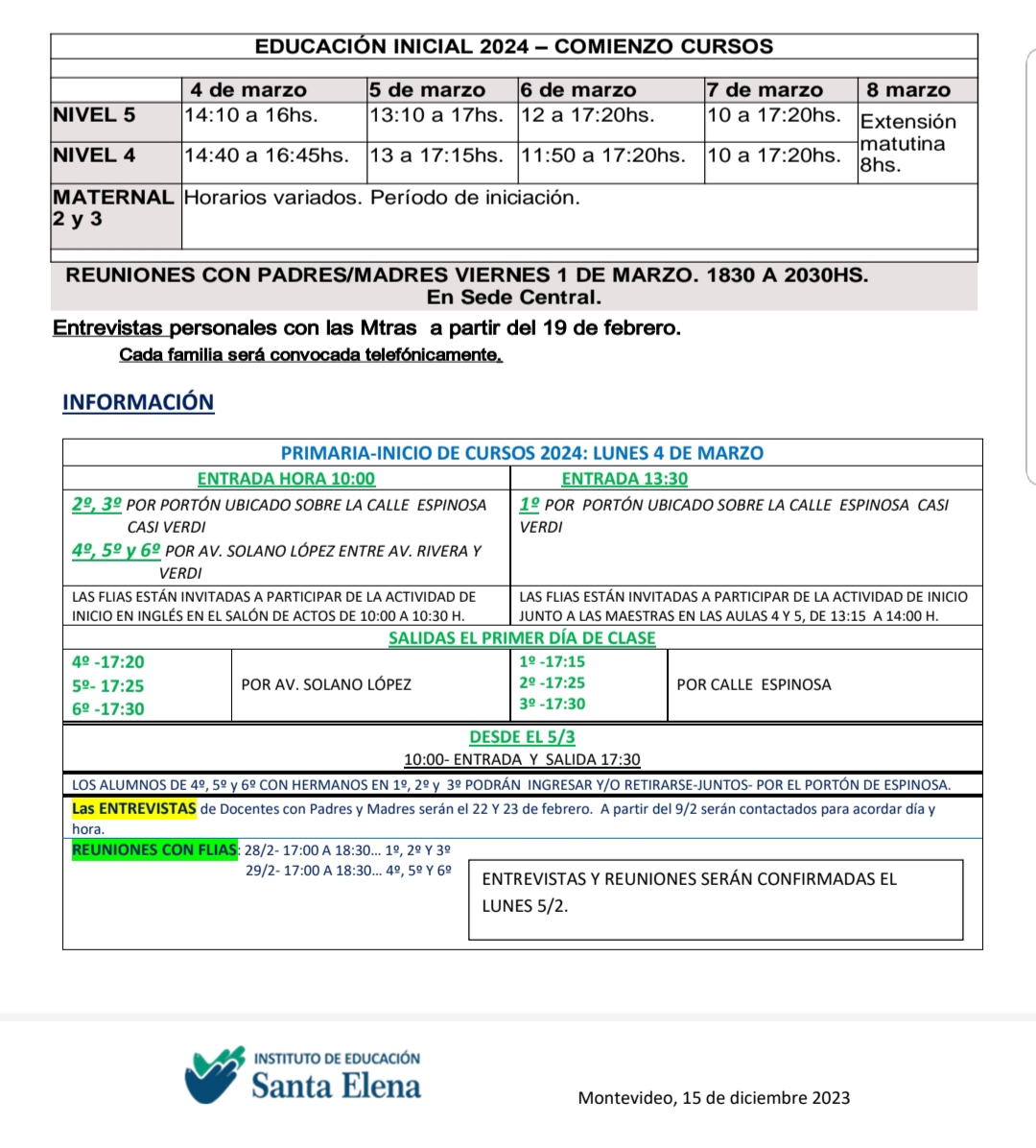 A continuación, compartimos las fechas y horarios del comienzo de cursos 2024 y otra información importante para las familias de Inicial y Primaria de la sede de Montevideo.