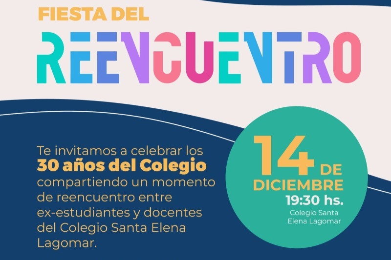 ¡Se viene la Fiesta del Reencuentro! El 14 de diciembre te invitamos a celebrar los 30 años del colegio compartiendo un momento de reencuentro entre ex alumnos/as y docentes de Santa Elena Lagomar. ¡Te esperamos!