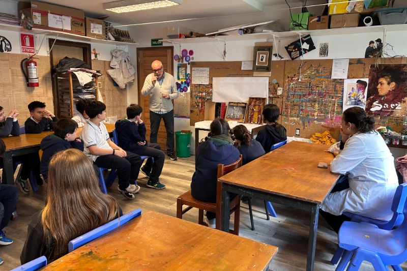 En el Taller de Arte, los grupos de 5.º año de Primaria recibieron la visita del artista plástico Gustavo Onorato, quien compartió su historia, su proceso creativo y comenzó a trabajar junto a ellos en una obra colectiva.